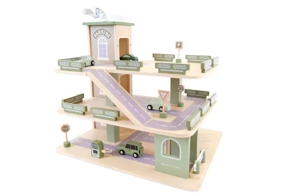 Een complete houten parkeergarage met drie lagen! Rijd de auto's naar boven via de hellingen of gebruik de lift. De lift is handmatig te bedienden. Op het dak vind je een helikopter platform met helikopter. Verder worden er veiligheidshekjes meegeleverd, verkeersbordjes, een slagboom, vier auto's en een benzine pomp. Ruime garage van 44 cm breed en 41 cm hoog. Deze Parking Experience van Bandits & Angels is in blauwtinten uitgevoerd.